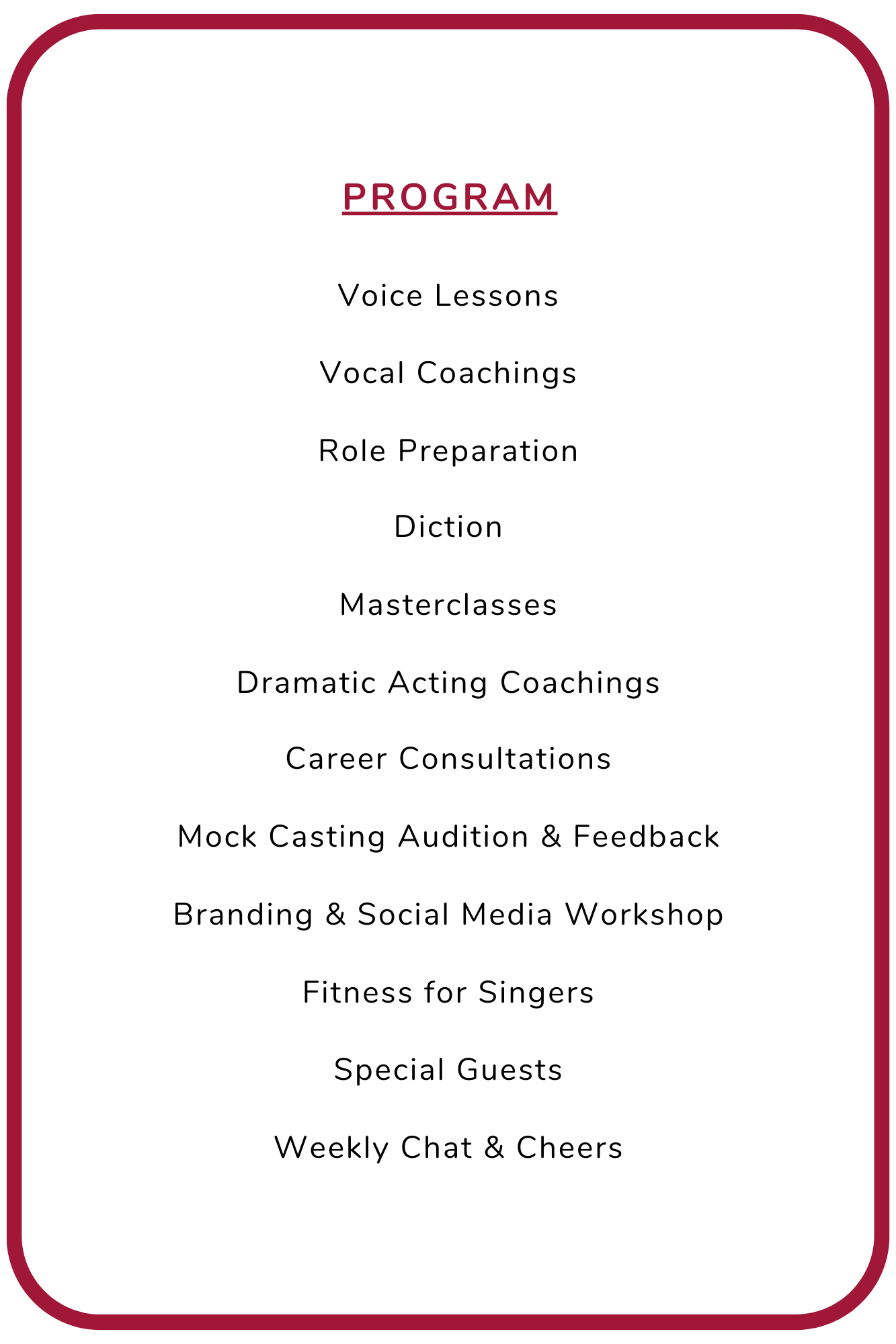 Mock Audition & Feedback: We will reserve one day for our virtual mock professional auditions with immediate live feedback, helping to maximize your audition preparedness and performance for the future.